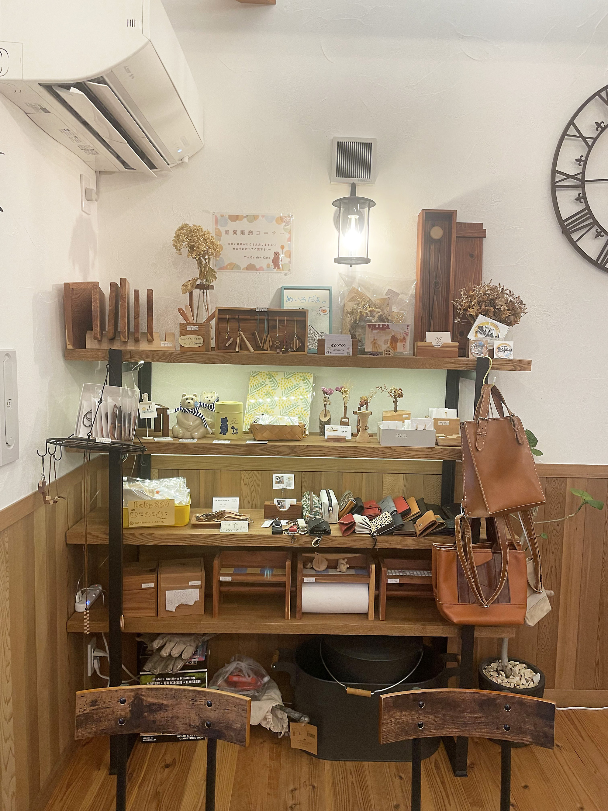 また、店内の棚では、知り合いの職人さんが作成した様々な手芸や小物を販売しています。