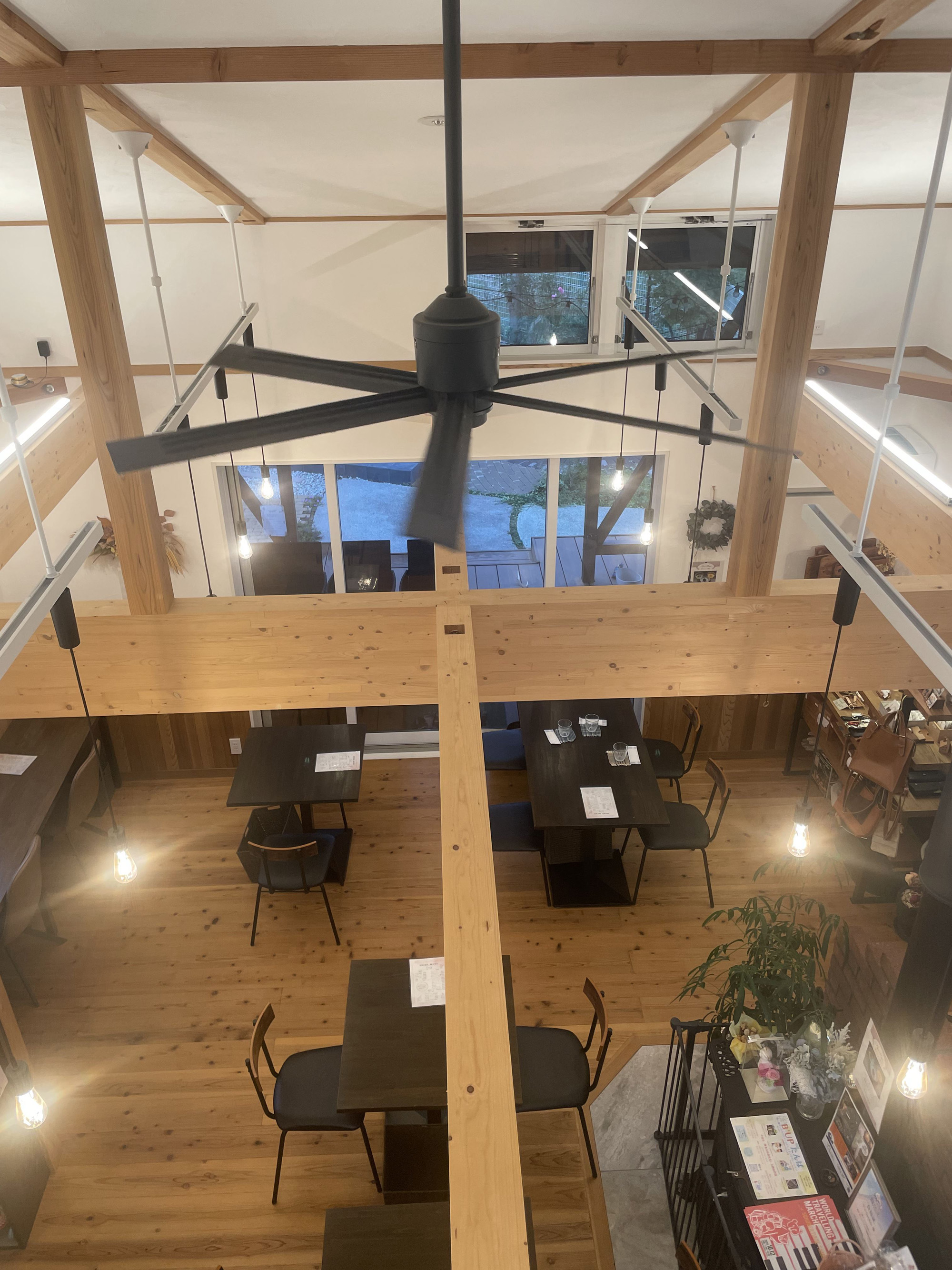 中からあたたかな光が漏れる格子窓の扉を開けると、吹き抜けで開放感のあるカフェスペースが広がっています。
