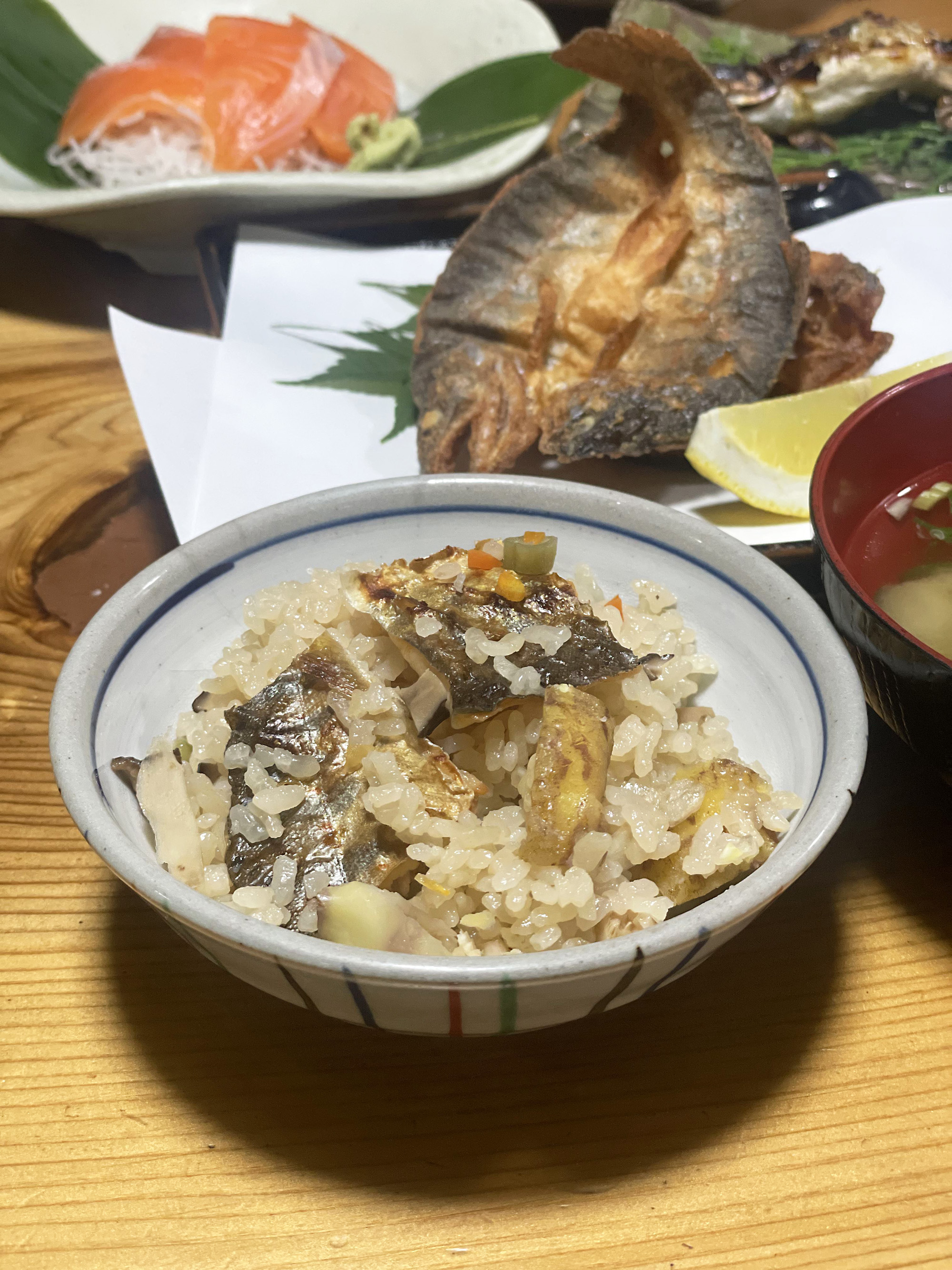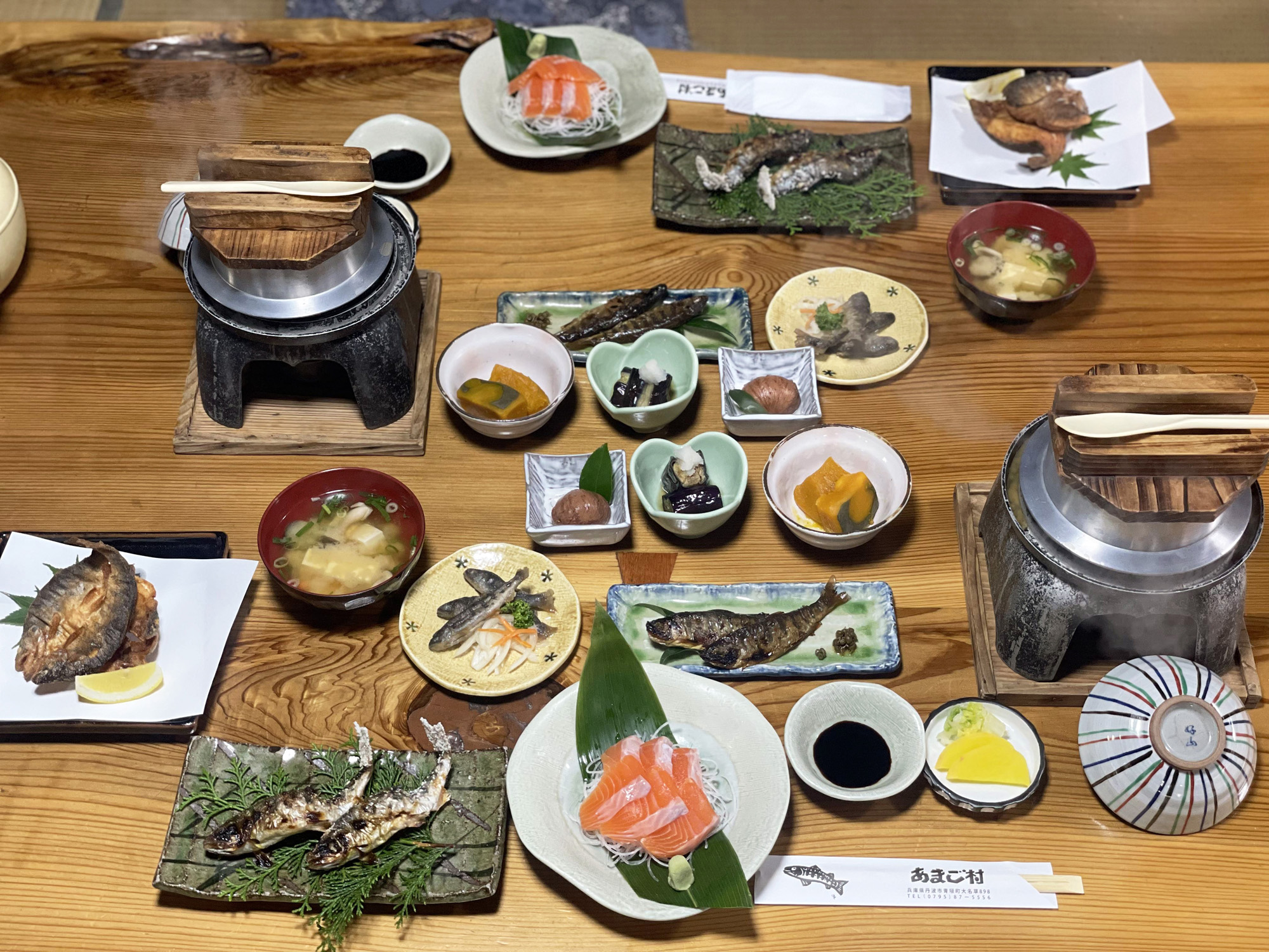 お刺身、塩焼き、唐揚げ、甘露煮、南蛮漬け、釜めし、小鉢、お味噌汁と、豊富な品数に驚きます。(写真は2人分のコースです)