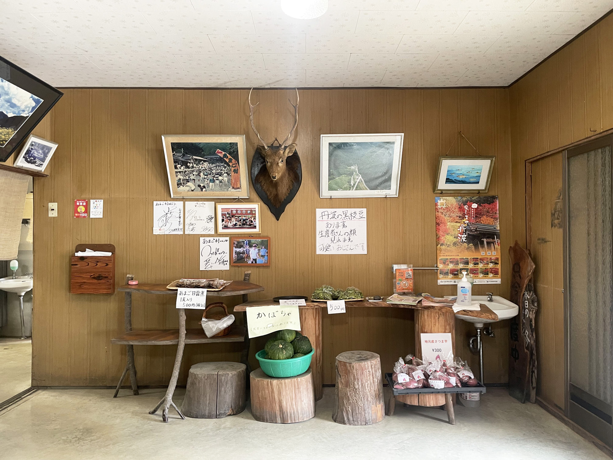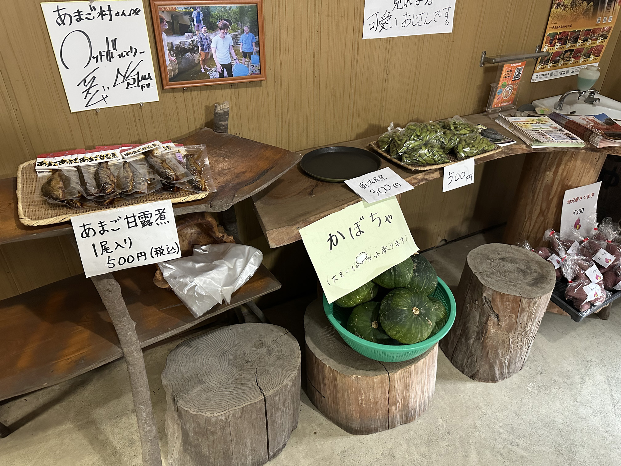 お店の入口から入ってすぐのお土産コーナーには、丹波産のカボチャやサツマイモといった野菜等、地域の方が作られた食材も販売されているので、ぜひお買い求めください。