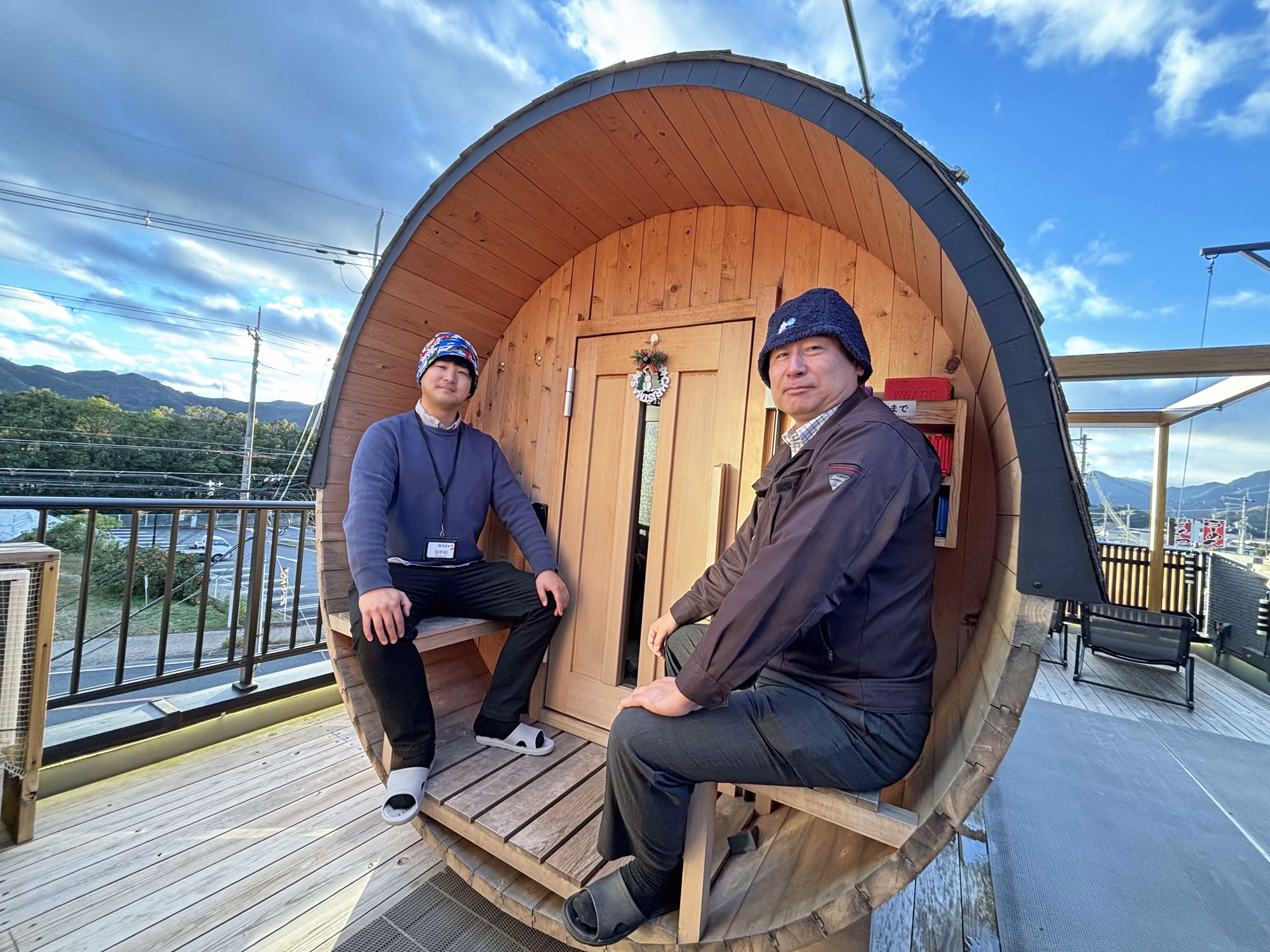 心楽オリジナルサウナの「YOKI SAUNA」は、薪ストーブを熱源とした丹波産ヒノキで作られたバレル型サウナです。
