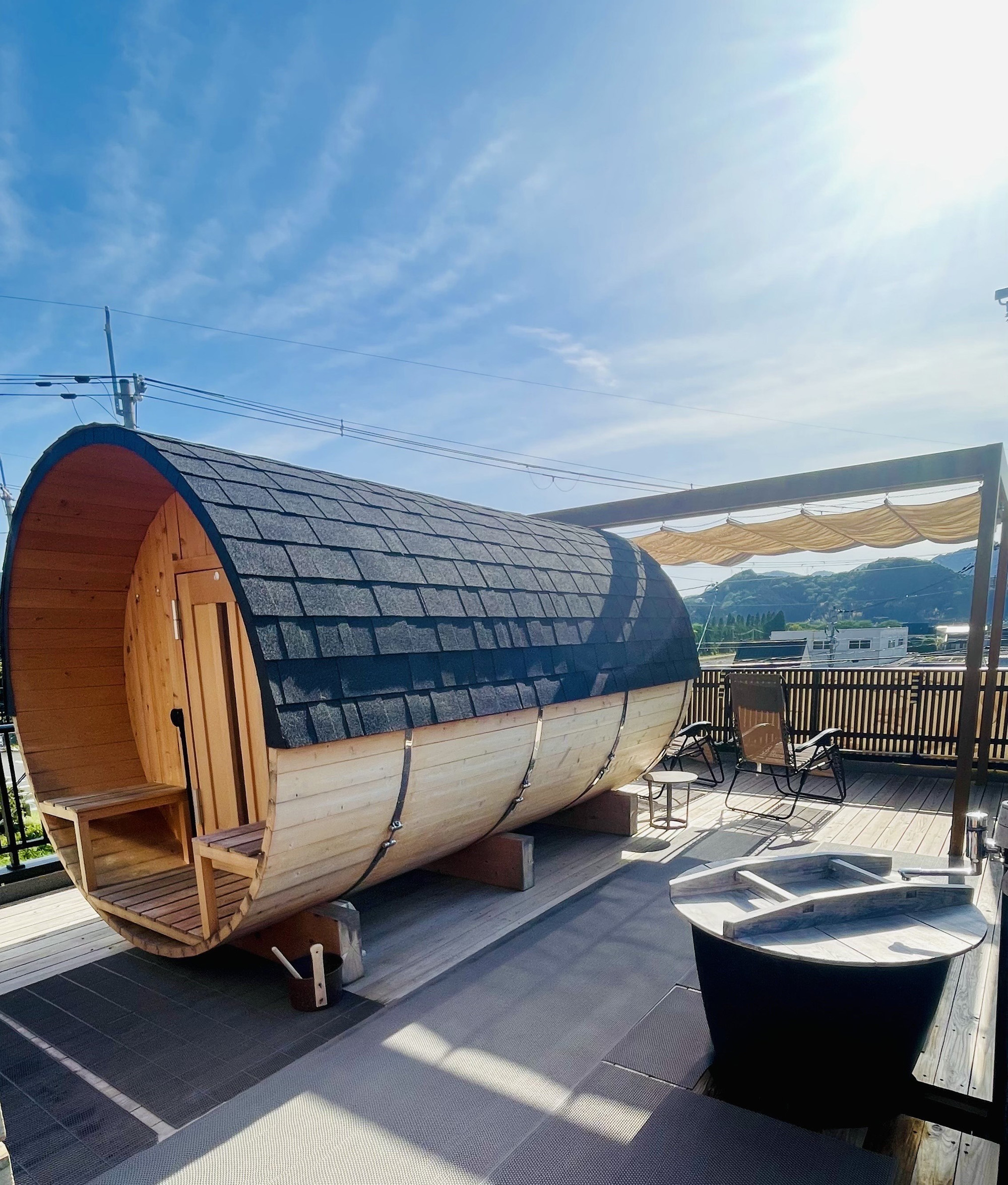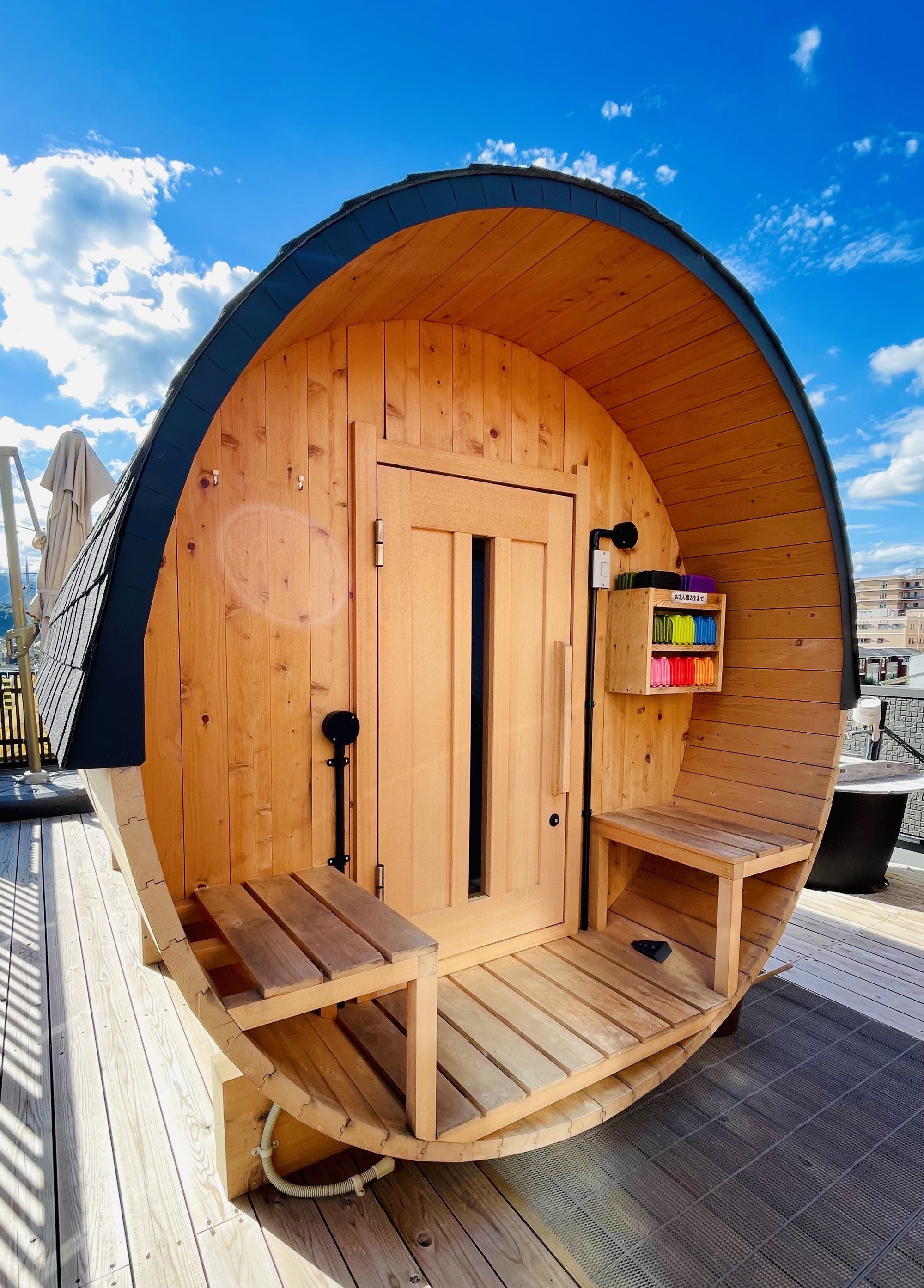 建物屋上の円筒形の施設が、本格バレルサウナです。こちらのバレルサウナはヒノキ仕様で、木の香りを楽しむことができます。