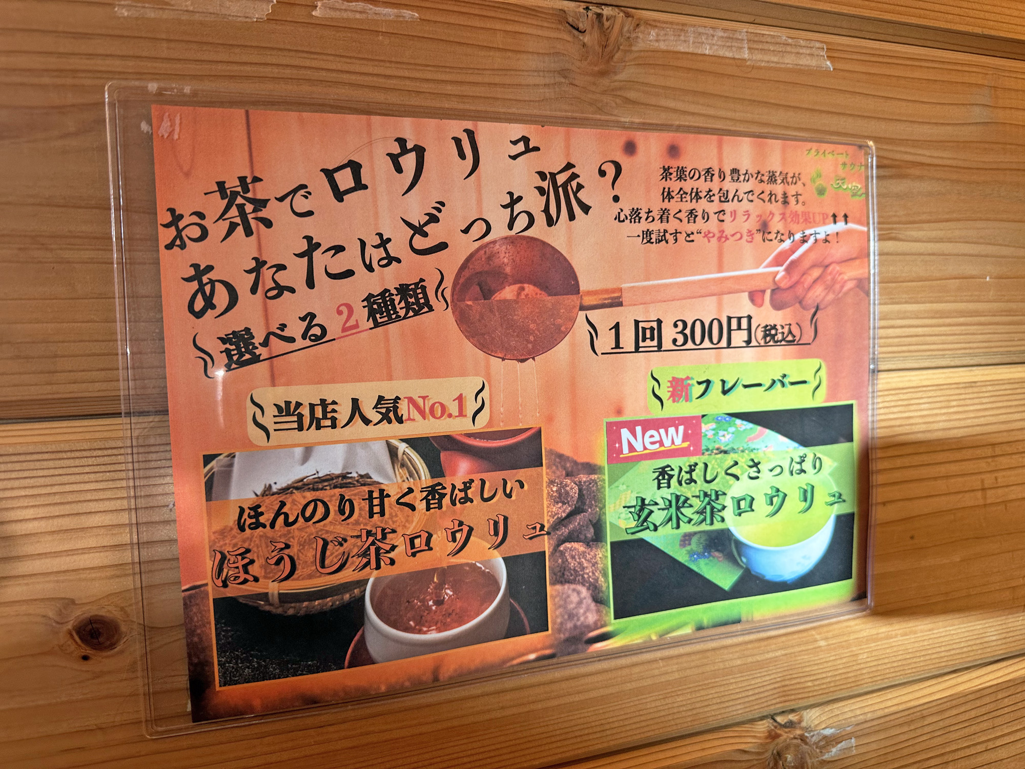 また、「ほうじ茶」「玄米茶」の2種類のお茶のロウリュが楽しめる珍しいサウナとなっています。