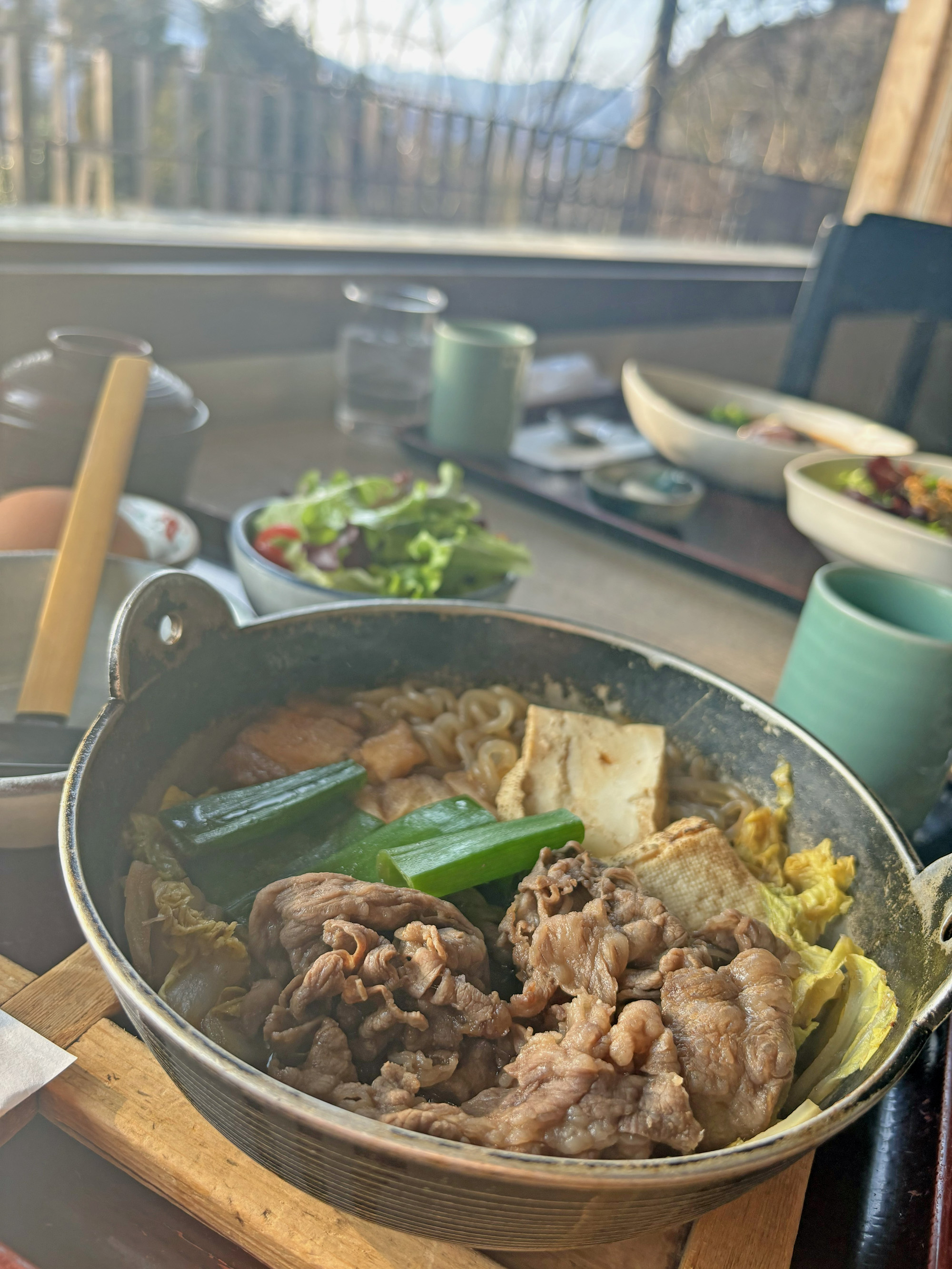 すきやき定食には、すきやき鍋、卵、サラダ、ごはん、香物、みそ汁がついています。