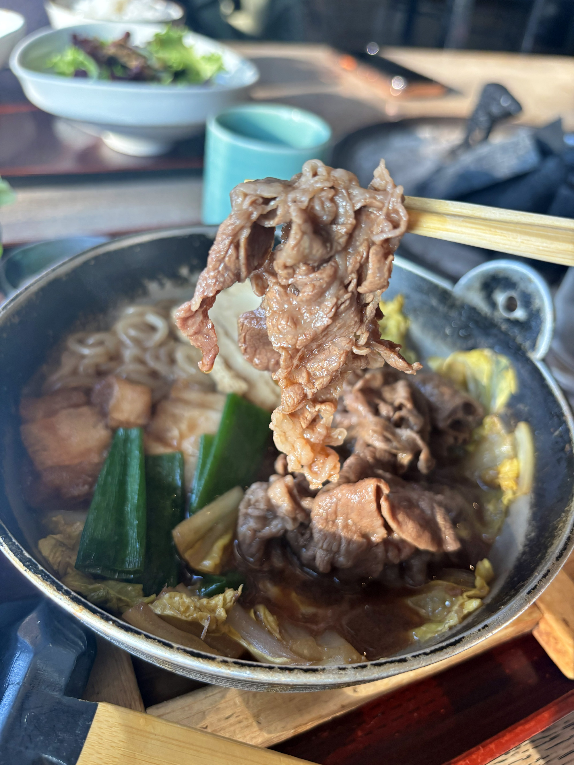 すきやき鍋の木蓋を開けると、湯気とともに割下の香ばしい香りが広がり、食欲が刺激されます。