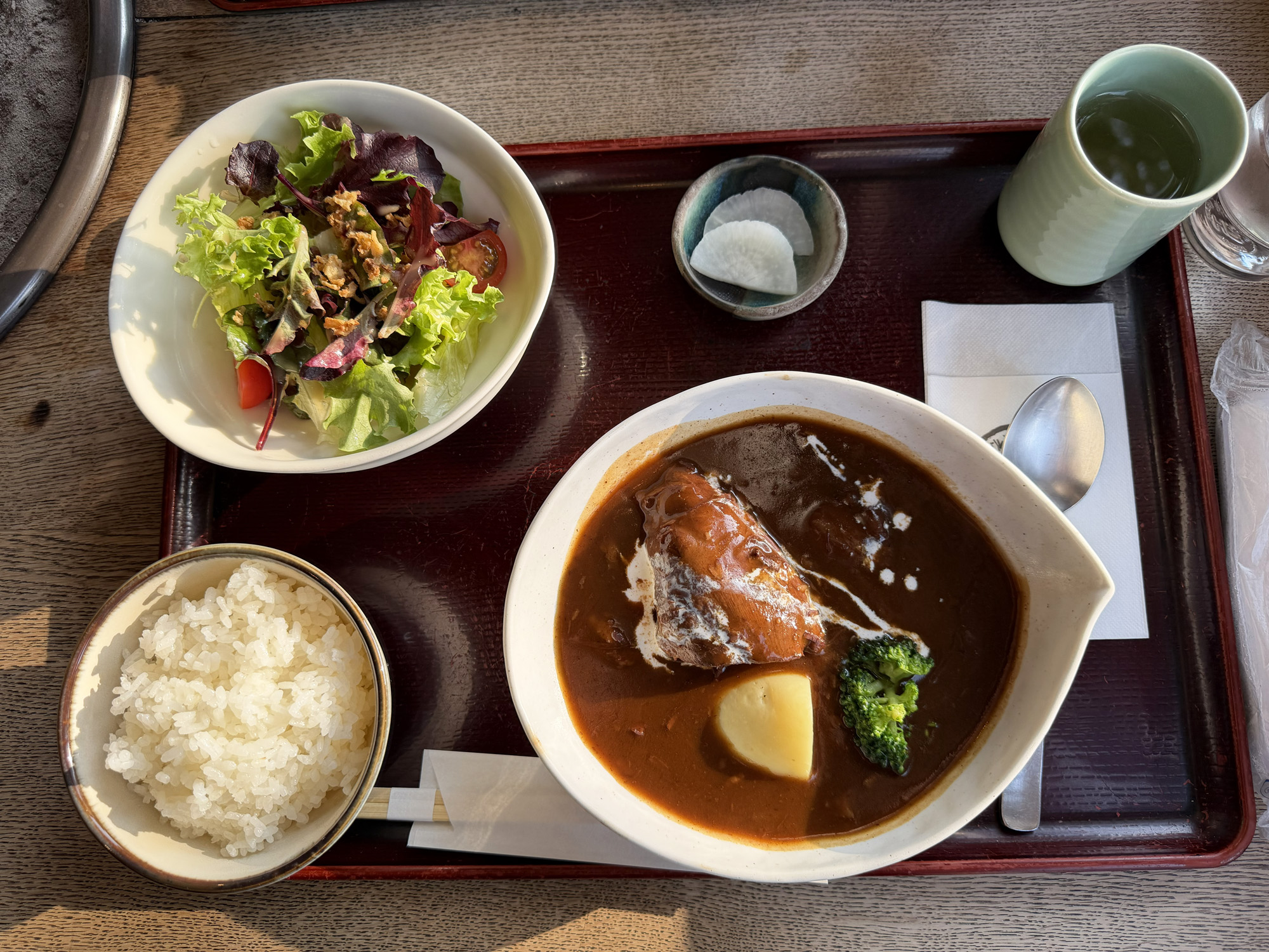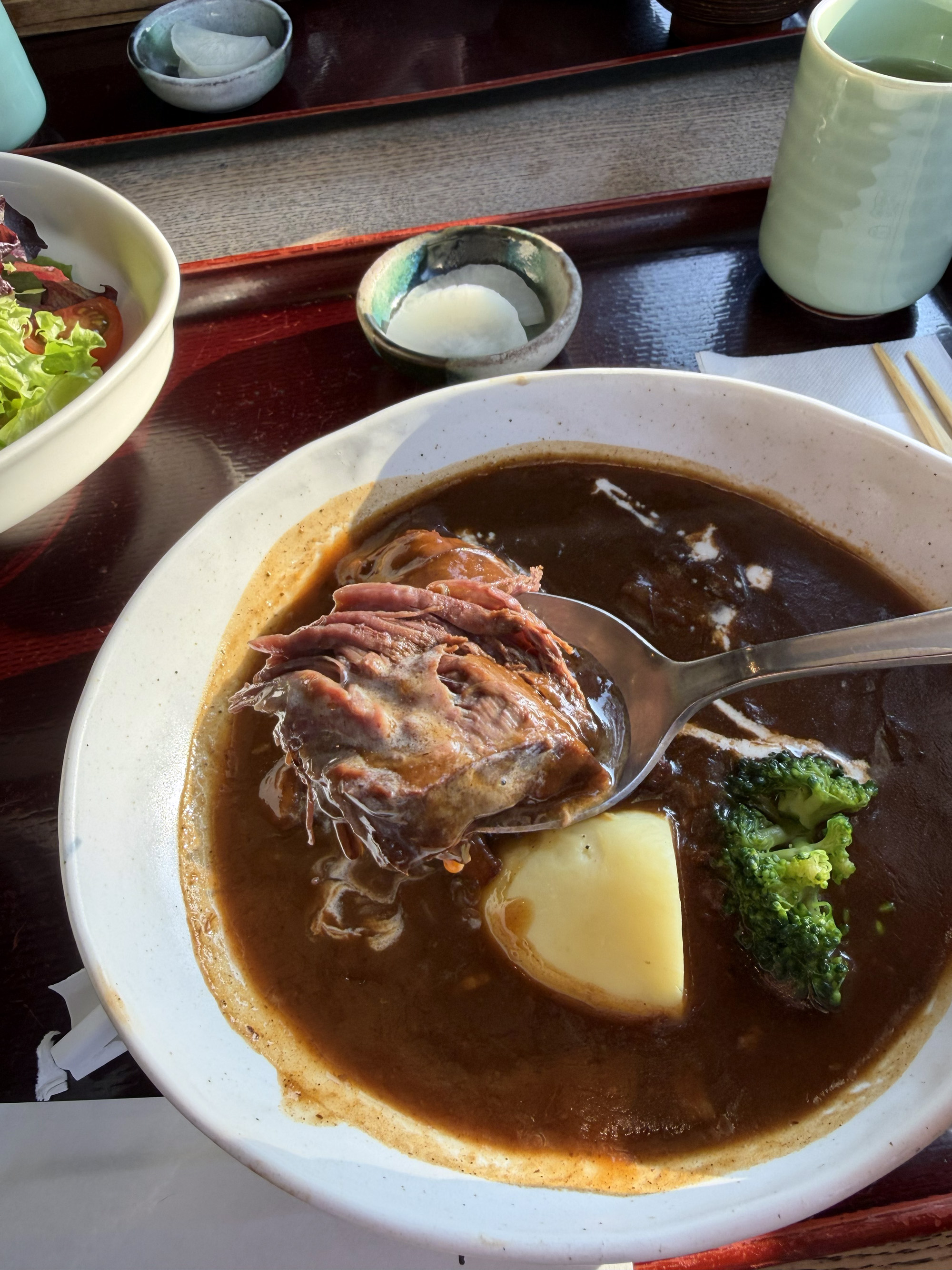 ビーフシチュー定食は、ビーフシチュー、サラダ、ごはん、香物がついています。