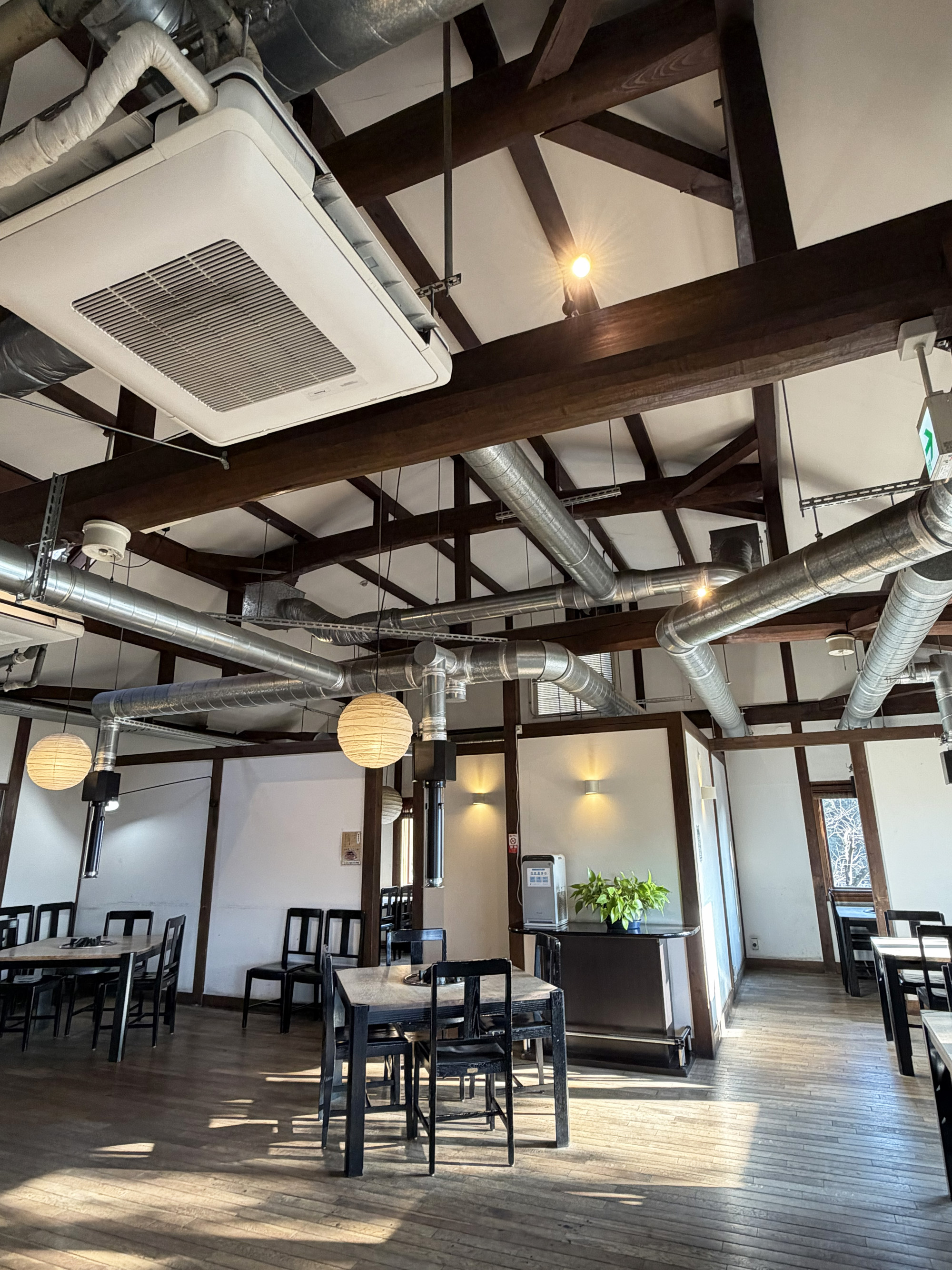 広々とした店内には、通路のゆとりをもって席が配置され、また、天井が高いため開放感があります。