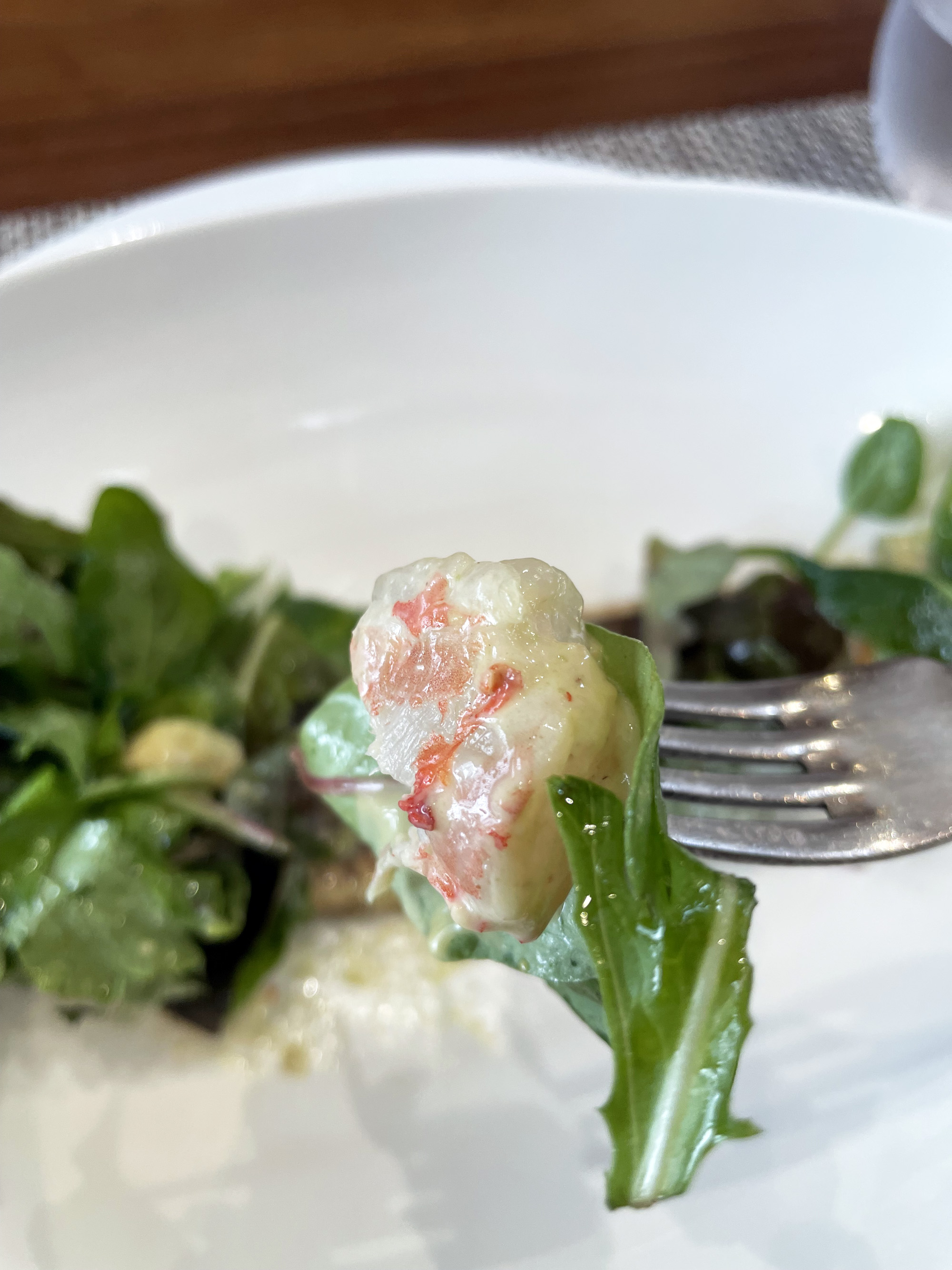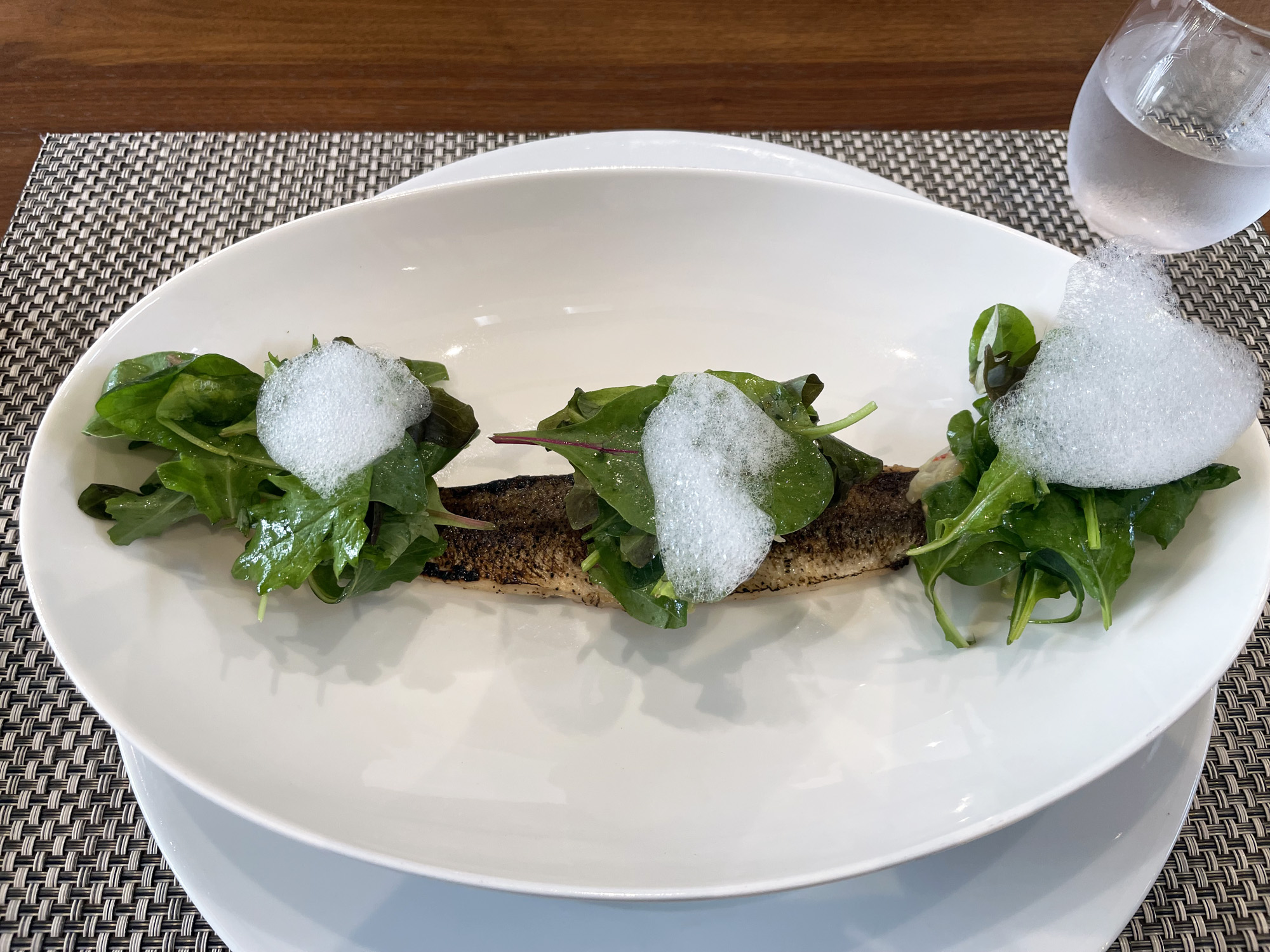 シャキシャキのベビーリーフの上に乗っている白い泡は、レモンの泡ドレッシングです。レモンの泡ドレッシングはふわふわ食感で、レモンのフレッシュな香りとやさしい酸味が、新鮮なベビーリーフと合わさり、爽やかな味が食欲を刺激し、これから出される料理への期待を高めていきます。