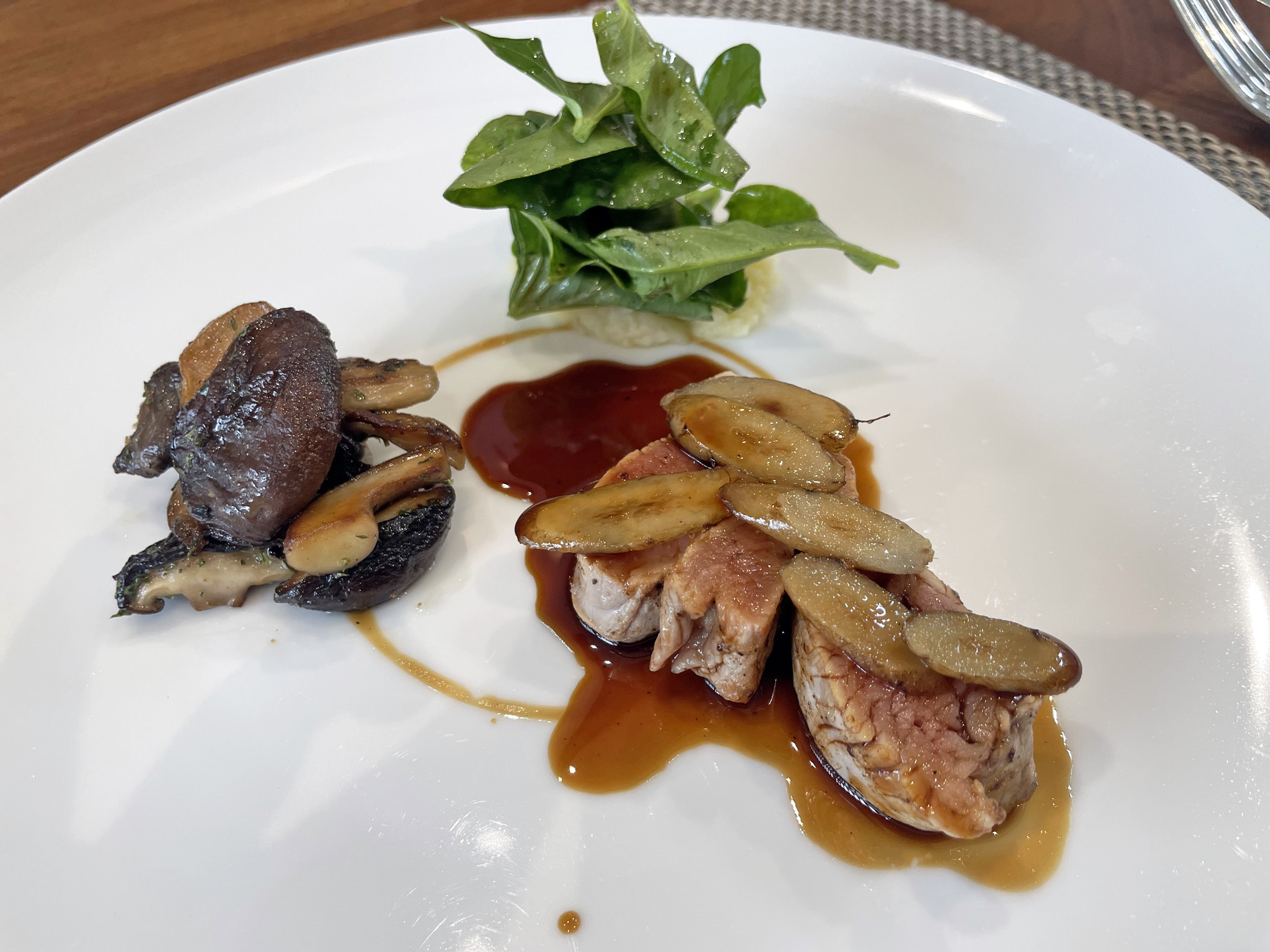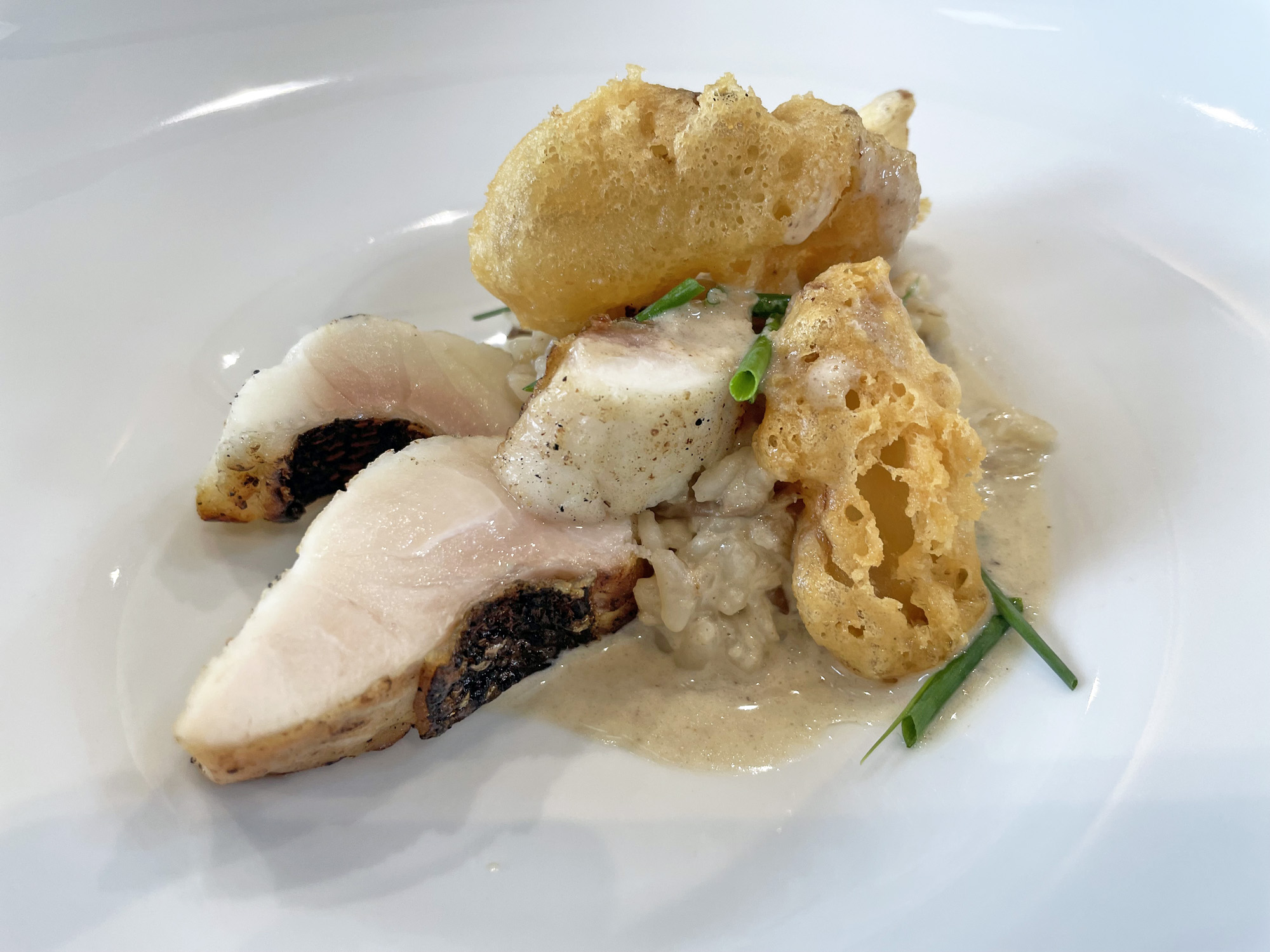 魚料理は、鳴門鯛のポワレにリゾットと舞茸のフリットが添えられ、きのこの風味が香るクリームソースでまとめられた一品です。