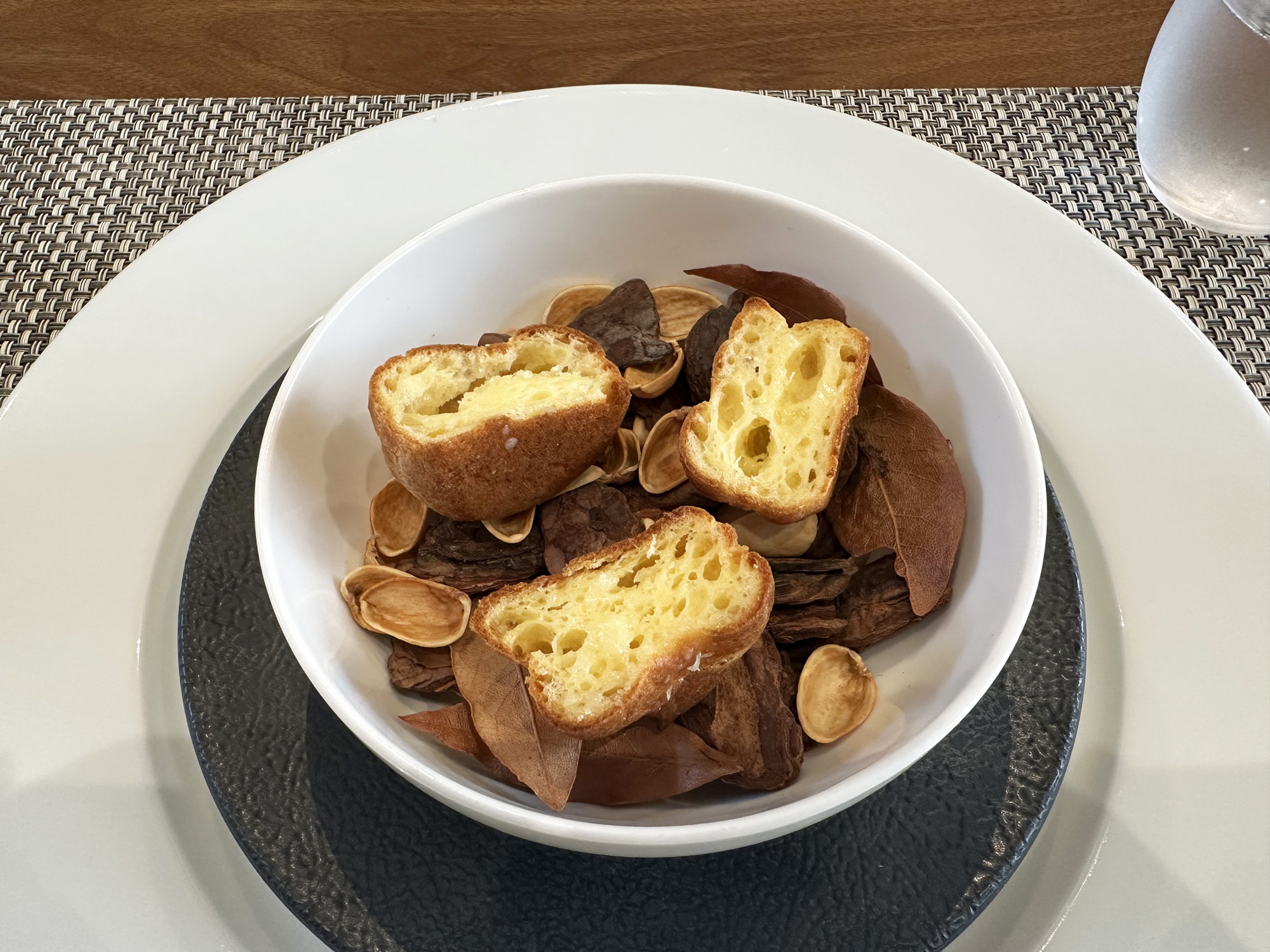 枯葉と木の実をあしらったお皿で登場したグジェールは、生地はふわふわで、口に含んだ時のクシュっとした独特な食感の後に、グリエールチーズ(スイス原産のハードチーズ)の芳醇な味と香りが口全体に広がり、チーズ好きな人にはたまらない一品となっています。